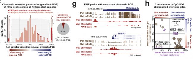 發(fā)現(xiàn) 30 個在 13 個成纖維細(xì)胞系中表現(xiàn)一致親源偏倚的 HSCA 元件,其中 5 個為新型印記元件,不依賴親源 CpG 甲基化差異(如 MAGEL2、ZDBF2 區(qū)域)。