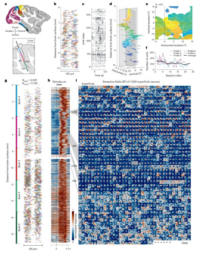 a,獼猴新皮層視覺區(qū)矢狀面分布,插圖為多組記錄探針軌跡。b,單組384位點(diǎn)記錄的神經(jīng)元波形空間分布。c,刺激對(duì)齊的群體放電柵格圖。d,202個(gè)視覺響應(yīng)神經(jīng)元的感受野深度分布,箭頭標(biāo)示視覺區(qū)間邊界。e,感受野在對(duì)側(cè)視野的覆蓋范圍。f,同一位置23次穿刺記錄的神經(jīng)元數(shù)量。g,5組記錄位點(diǎn)(約19毫米)的3,029個(gè)神經(jīng)元波形分布。h,2,729個(gè)視覺響應(yīng)神經(jīng)元的刺激反應(yīng)熱圖,灰色標(biāo)注LVM/HM/UVM對(duì)應(yīng)深度。i,1,500個(gè)表層神經(jīng)元的感受野熱圖陣列(26×32度視野)。