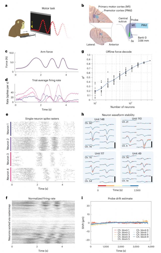 a,"吃豆人"等長力追蹤任務(wù)。b,運(yùn)動(dòng)皮層記錄靶區(qū)(左)與溝內(nèi)M1矢狀面示意圖(右)。c,任務(wù)期間平均臂力。d-e,示例神經(jīng)元的試次平均放電與單試次柵格圖。f,Rastermap排序的360個(gè)神經(jīng)元?dú)w一化反應(yīng)。g,神經(jīng)元數(shù)量與力預(yù)測精度的關(guān)系。h,四個(gè)神經(jīng)元在十個(gè)通道的波形穩(wěn)定性。i,Kilosort 2.5估計(jì)的運(yùn)動(dòng)任務(wù)期間探針漂移。