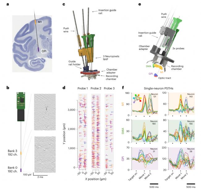 a,單探針同步記錄運(yùn)動(dòng)皮層與基底節(jié)(GPi),各分配192通道。b,對(duì)應(yīng)原始波形。c-d,多探針匯聚軌跡記錄PMd區(qū)673個(gè)神經(jīng)元。e-f,三探針平行軌跡記錄SMA、M1與GPi區(qū)。