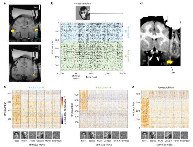 a,ML與AF面孔斑塊的MRI定位(黃為fMRI面孔選擇響應(yīng))。b,猴臉刺激的同步放電柵格圖。c,96種刺激的響應(yīng)熱圖顯示面孔選擇性細(xì)胞聚集。d,最深A(yù)M斑塊(距顱骨42毫米)的MRI定位。e,AM區(qū)面孔細(xì)胞響應(yīng)特征。