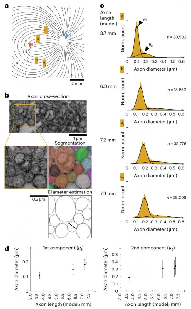 (所有數(shù)據(jù)來自同一供體)a. TEM采樣位點(diǎn)(a-d)與模型軌跡疊加。b. TEM圖像分割示例(顏色區(qū)分不同軸突)。c. 四個(gè)位點(diǎn)的軸突直徑分布(黑線:高斯混合模型擬合)。d. 軸突直徑與模型長度的正相關(guān)關(guān)系(長度3.7→7.3mm時(shí)直徑增加80%)。