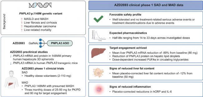 寡核苷酸藥物:通過RNA干擾(如反義寡核苷酸、siRNA)降低PNPLA3突變蛋白表達(dá),可改善肝臟脂肪變性和炎癥。阿斯利康最近公布了AZD2693注射液的最新結(jié)果:AZD2693能有效降低肝臟 PNPLA3 mRNA(−89%)和肝脂滴上的蛋白質(zhì)水平。在臨床應(yīng)用上,總體耐受性良好,沒有出現(xiàn)因不良事件導(dǎo)致停藥的情況,也未發(fā)生與治療相關(guān)的嚴(yán)重不良事件。
