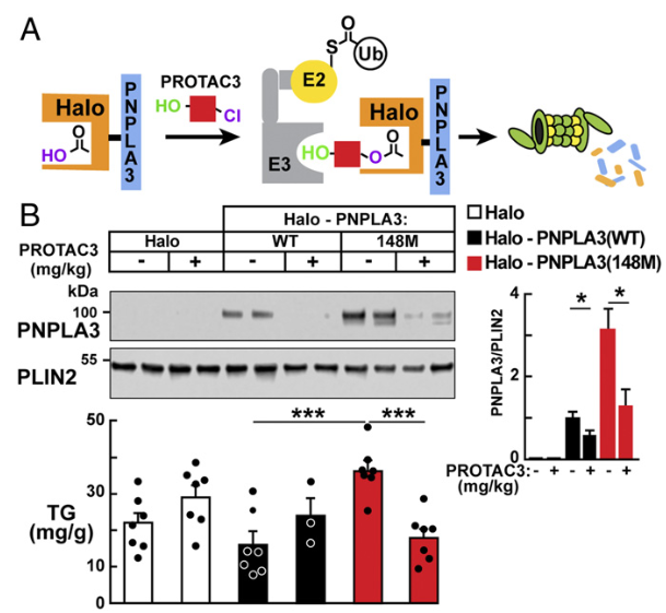蛋白降解:盡管目前尚無基于PROTAC(蛋白水解靶向嵌合體)技術(shù)的藥物,但一項(xiàng)關(guān)鍵臨床前研究成功開發(fā)了靶向PNPLA3的降解劑PROTAC 3。該分子結(jié)構(gòu)包含兩個(gè)關(guān)鍵域:E3泛素連接酶招募域和靶蛋白結(jié)合域。結(jié)果表明,在表達(dá)人源PNPLA3 148M突變蛋白的小鼠肝臟中,PROTAC 3處理顯著降低突變蛋白水平,并改善了與突變蛋白表達(dá)相關(guān)的脂肪肝病。