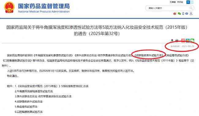 正式納入《化妝品安全技術(shù)規(guī)范(2015年版)》相應(yīng)章節(jié)。該方法將于2026年3月1日起全面實(shí)施;在正式實(shí)施前,鼓勵(lì)化妝品注冊(cè)、備案相關(guān)檢驗(yàn)提前采用。其中,離體豬皮膚在《化妝品用化學(xué)原料皮膚吸收體外試驗(yàn)方法》中被作為