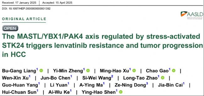 Liang BG, Zheng YM, Xu MH, Gao C, Xu WX, Chen JB, Wang SW, Yang GH, Zhao LT, Yuan L, Ma AY, Dong ZN, Cai JB, Sun HC, Ke AW, Shen YH. The MASTL/YBX1/PAK4 axis regulated by stress-activated STK24 triggers lenvatinib resistance and tumor progression in hepatocellular carcinoma. Hepatology. 2025 Jun 2. doi: 10.1097/HEP.0000000000001392.