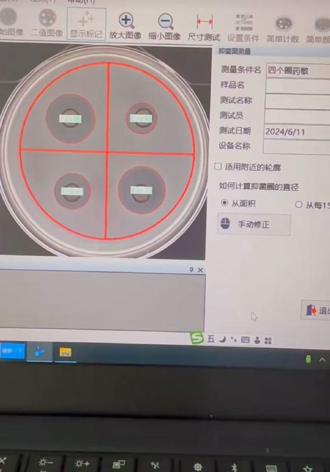 將在規(guī)定條件下培養(yǎng)后的雙碟,放入菌落計數(shù)儀內,啟動抑菌圈測定軟件,一鍵即可測量出各個抑菌圈直徑(或面積),測量結果可以直接在屏幕顯示或傳輸?shù)紼XCEL文件。