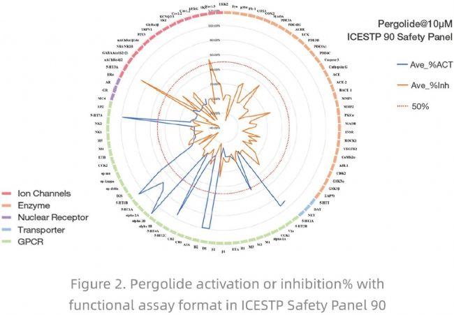 在 ICESTP Safety Panel 90 實(shí)驗(yàn)中,Pergolide 表現(xiàn)出較低的選擇性,在 10μM 濃度下,共有 12 個(gè)靶標(biāo)顯示出超過(guò) 50% 的激活作用,2 個(gè)靶標(biāo)顯示出超過(guò) 50% 的抑制作用,這些脫靶效應(yīng)增加了心臟瓣膜病變的風(fēng)險(xiǎn),也驗(yàn)證了 Pergolide 用藥安全性問(wèn)題。