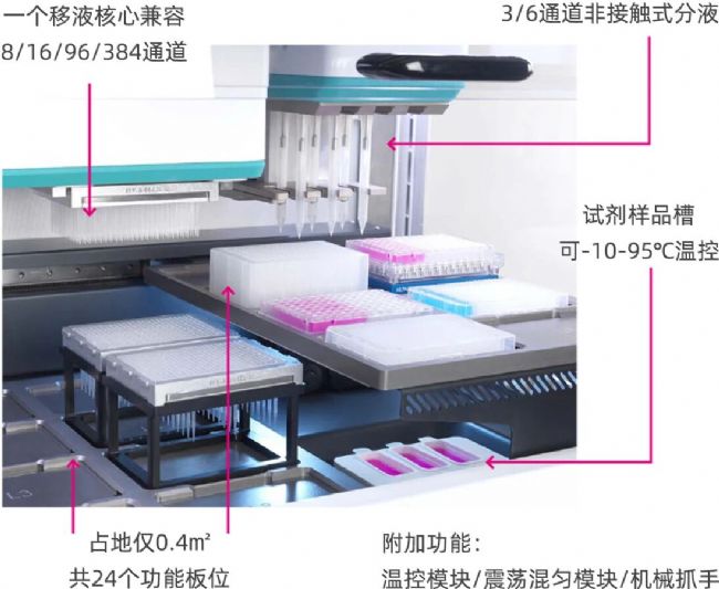 firefly®具備24個(gè)功能板位;配備震蕩和溫控模塊以及機(jī)械抓手;滿足實(shí)驗(yàn)流程中耗材的持續(xù)供應(yīng)、樣本混勻/溫控和孔板轉(zhuǎn)移等需求,減少人為干預(yù) 。
