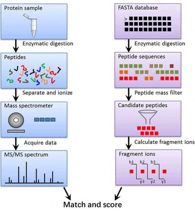 圖2 數(shù)據(jù)庫(kù)搜索基本原理示意(Picture Ref.: Jimmy K. Eng,et.al.,2011,MCP)