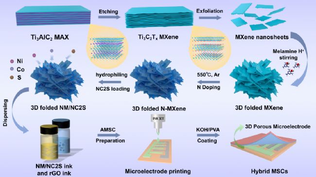 本研究使用MicroFab Jetlab II高精度噴墨打印系統(tǒng)解決復(fù)合材料的沉積問(wèn)題,成功實(shí)現(xiàn)了復(fù)雜結(jié)構(gòu)材料的噴墨打印,利用噴墨打印的高精度優(yōu)勢(shì)制備了高性能的混合MSCs,通過(guò)Ni原子和O原子的新型橋接機(jī)制將NiCo2S4錨定在N-MXene上,制備了3D N-MXene/NiCo2S4,顯著提高了HMSC的比電容(983.9 F cm-3)和25000次循環(huán)的穩(wěn)定性(98.0%),在15.4 W cm-3的功率密度下,HMSC的能量密度達(dá)到342.4 mWh cm-3 ,性能優(yōu)于以前報(bào)道的噴墨打印 MSCs,在可穿戴微電子領(lǐng)域顯示出巨大的應(yīng)用潛力。噴墨打印為技術(shù)微電子器件提供更高的性能輸出,助力下一代微電子技術(shù)發(fā)展。