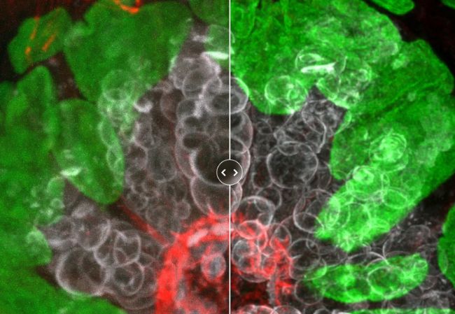 與迄今為止的標(biāo)準(zhǔn)方法相比,使用 LIGHTNING 獲得的共聚焦圖像仿佛去掉了一層霧氣。 用這種方法獲得的圖像可以一覽無遺地呈現(xiàn)出清晰的重要信息。 此外,LIGHTNING 圖像信息提取技術(shù)將 STELLARIS 共聚焦平臺(tái)的分辨率擴(kuò)展到超分辨率領(lǐng)域——最小能夠解析120納米級(jí)別的結(jié)構(gòu)。