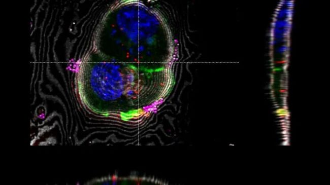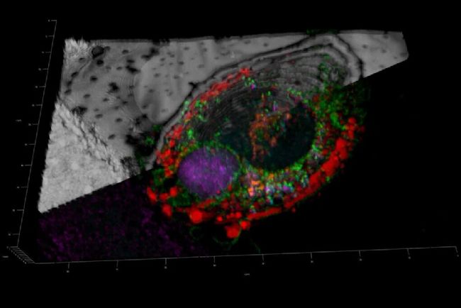 哺乳動(dòng)物細(xì)胞顯示Hoechst(藍(lán)色,細(xì)胞核),Mitotracker Green(綠色,線粒體)、Bodipy(紅色,脂滴)、熒光珠(品紅色,1µm),反射(白色)。比例尺10µm:細(xì)胞由德國(guó)海德堡歐洲分子生物學(xué)實(shí)驗(yàn)室Mahamid團(tuán)隊(duì)的Ievgeniia Zagoriy提供