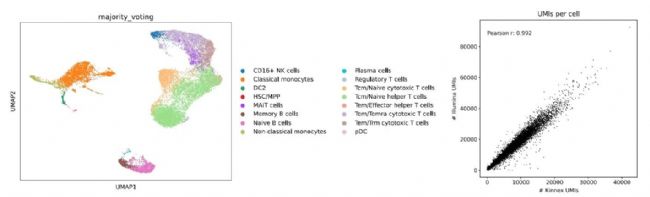 左圖為進(jìn)一步使用三級生信工具CellTypist處理Revio測序得到的PBMC 10x 5' 單細(xì)胞SMRT Link輸出結(jié)果的細(xì)胞聚類UMAP圖,鑒定了PBMC數(shù)據(jù)集中含有的不同細(xì)胞類型。右圖為同時構(gòu)建HG002樣本的10x 5' 單細(xì)胞Kinnex和Illumina文庫后測序結(jié)果比對的Pearson相關(guān)性展示圖,Pearson相關(guān)性系數(shù)為0.992,由此可見兩者細(xì)胞UMI計數(shù)的高度一致性。