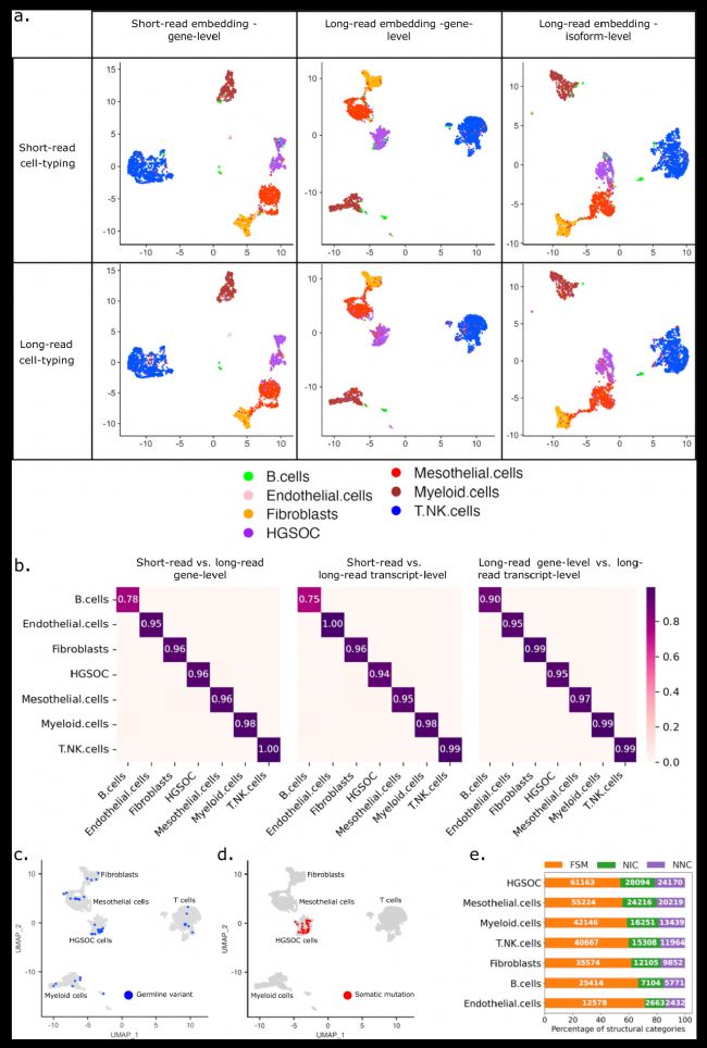 了解癌癥的腫瘤內(nèi)異質(zhì)性及其與腫瘤微環(huán)境(TME)的復(fù)雜相互作用需要單細(xì)胞分辨率的基因型和表型信息。在瑞士蘇黎世聯(lián)邦理工學(xué)院研究團隊的一項研究中,研究者采用10x Genomics平臺進(jìn)行單細(xì)胞捕獲,結(jié)合串聯(lián)的實驗策略對網(wǎng)膜轉(zhuǎn)移的卵巢癌患者的腫瘤和癌旁配對樣本進(jìn)行了基于PacBio全長的單細(xì)胞轉(zhuǎn)錄組測序,共檢測到152,000個轉(zhuǎn)錄異構(gòu)體,其中超過52,000個是新發(fā)現(xiàn)的轉(zhuǎn)錄異構(gòu)體。該研究中,研究人員同時進(jìn)行了長讀長和短讀長測序,發(fā)現(xiàn)兩者單獨鑒定的細(xì)胞類型和種類占比都非常相似,并表明通過PacBio的全長單細(xì)胞轉(zhuǎn)錄組測序可檢測到細(xì)胞類型特異性轉(zhuǎn)錄異構(gòu)體,揭示了腫瘤和間皮細(xì)胞中的差異異構(gòu)體表達(dá),還發(fā)現(xiàn)間皮細(xì)胞在轉(zhuǎn)移中部分通過TGF-β/miR-29/膠原軸轉(zhuǎn)變?yōu)榘┌Y相關(guān)成纖維細(xì)胞。此外,研究人員通過單細(xì)胞全長轉(zhuǎn)錄組準(zhǔn)確識別了融合基因,包括一種新的經(jīng)過scDNA測序驗證的IGF2BP2::TESPA1融合,該融合在匹配的二代短讀長測序中不僅沒有發(fā)現(xiàn),且被錯誤歸類為TESPA1基因高表達(dá)。這是由于二代測序讀長較短,無法跨越和覆蓋基因的融合位點,僅捕獲到了該融合基因的 3' 端融合部分,即 TESPA1 基因部分,從而導(dǎo)致錯誤的分析結(jié)果。