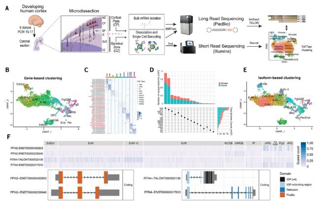 圖1 妊娠中期發(fā)育中人類大腦新皮層的細(xì)胞類型特異性的全長轉(zhuǎn)錄組實驗設(shè)計,轉(zhuǎn)錄異構(gòu)體多樣性的表征與細(xì)胞聚類和差異表達(dá)異構(gòu)體分析