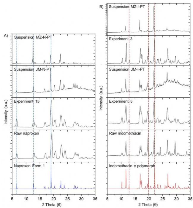通過氣流粉碎和微流化法制備的(A)萘普生和(B)吲哚美辛顆粒的X射線粉末衍射(XRPD)圖譜