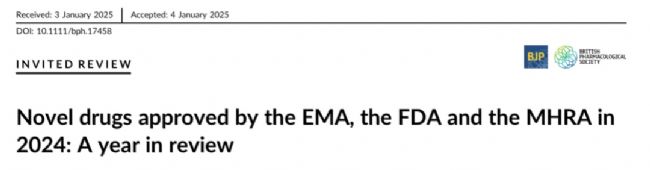 本文數(shù)據(jù)來源于《British Journal of Pharmacology》2025年4月綜述“Novel drugs approved by the EMA, the FDA and the MHRA in 2024: A year in review”。《British Journal of Pharmacology》:藥理學領(lǐng)域的“年度風向標”,創(chuàng)刊于1908年,專注于藥物作用機制、新藥發(fā)現(xiàn)及監(jiān)管科學,最新影響因子為7.7(2023年)。其年度新藥綜述因覆蓋三大機構(gòu)、深度解析機制創(chuàng)新,已成為全球醫(yī)藥行業(yè)、監(jiān)管機構(gòu)及臨床醫(yī)生的“決策參考手冊”。