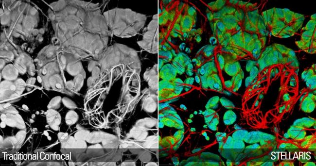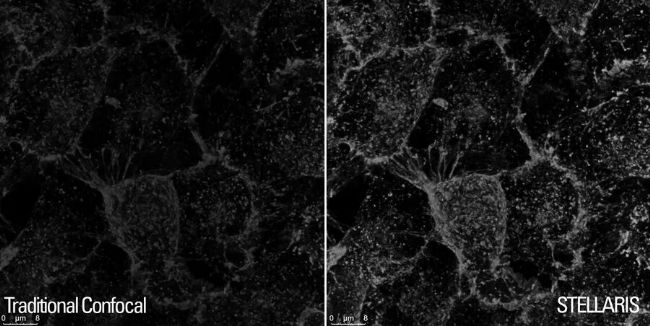 用WGA-CF488染料標記的海拉細胞。 左: 傳統(tǒng)的光子計數(shù)結果;右: Power Counting的結果。 圖中為Z-stack的最大強度投影,用12kHz共振掃描儀獲得,用LIGHTNING處理Power HyD S探測器是STELLARIS的新核心部分。這些硅基多像素光子計數(shù)器(MPPC)探測器是徠卡顯微系統(tǒng)多年工程設計經(jīng)驗的成果。這一增強的圖像質(zhì)量樹立起共聚焦成像新標準。
