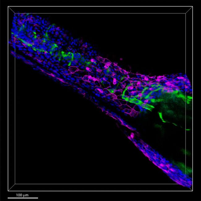 斑馬魚胚胎。 用STELLARIS 8獲得3D圖像,裝配Power HyD S(細胞核:藍色,Hoechst)、Power HyD X(內(nèi)皮細胞:綠色,EGFP)和Power HyD R探測器(細胞膜:品紅色,NIR750)。 樣本由法國斯特拉斯堡的IGBMC的Julien Vermot提供