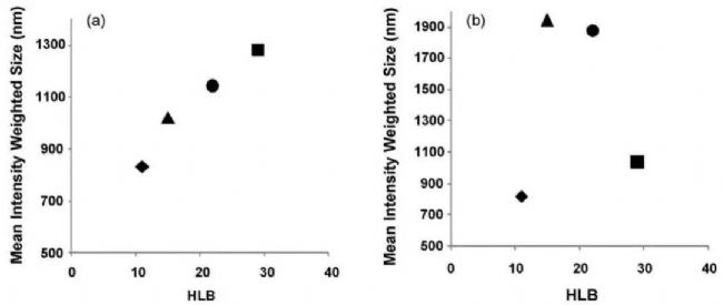 布洛芬懸浮液粒徑與穩(wěn)定劑HLB值的關(guān)系:(a) 沉淀法,(b) 微射流法。(♦)羥丙甲纖維素(HPMCs),(▲)吐溫80,(●)泊洛沙姆F-127,(■)泊洛沙姆F-68