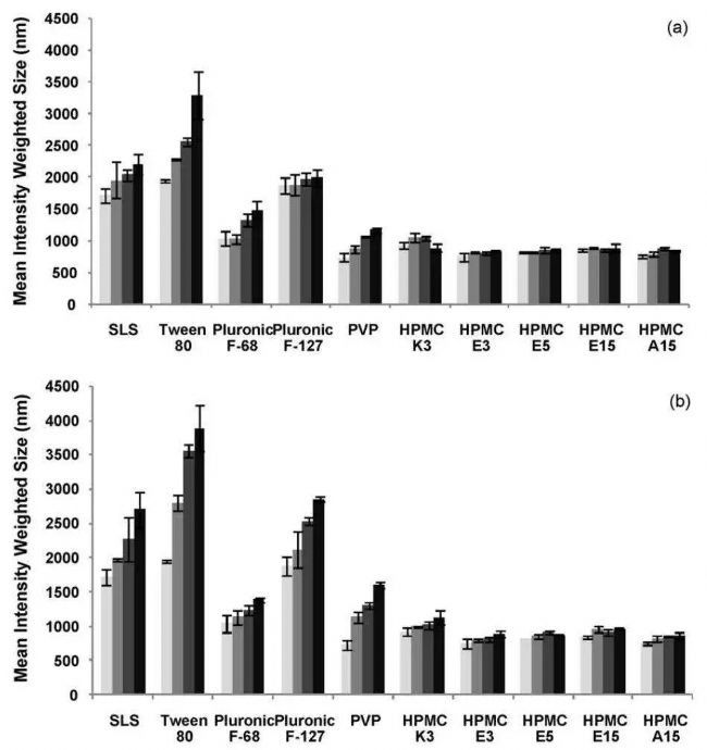 不同加工條件下穩(wěn)定劑行為的差異可以通過沉淀技術(shù)的某些方面與乳液形成(HLB系統(tǒng)主要是為此開發(fā)的)性質(zhì)相似來解釋,因為顆粒是通過相不相容性從溶液中形成的。然而,HLB值不太可能在通過微射流均質(zhì)法制備的納米混懸液中起主導作用。通過微射流均質(zhì)法獲得的粒徑似乎與布洛芬在各種穩(wěn)定劑溶液中的溶解度(25°C)相關(guān)(圖5和6)。對布洛芬固有水溶性(0.049 mg/ml)影響最小的穩(wěn)定劑(PVP K-30、Pluronic F-68和HPMCs)導致較低的平均粒徑,與顯著增加布洛芬溶解度的穩(wěn)定劑(SLS、Tween 80和Pluronic F-127)相比。