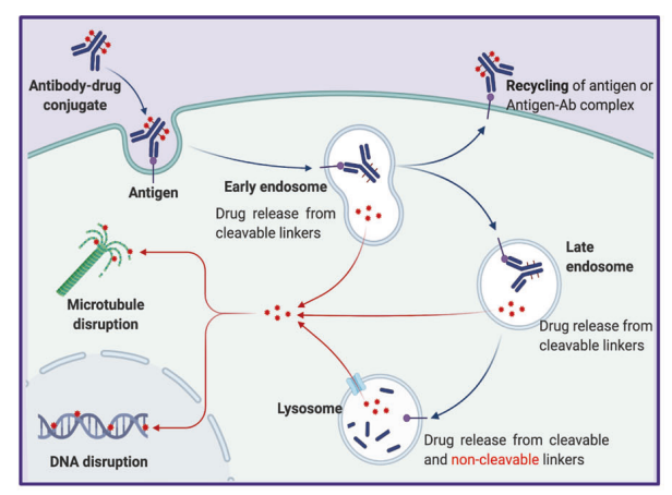內吞轉運:ADC-抗原復合物通過Clathrin或Caveolin蛋白介導的內吞作用進入細胞,依次形成初級內體(Early Endosome)和次級內體(Late Endosome);