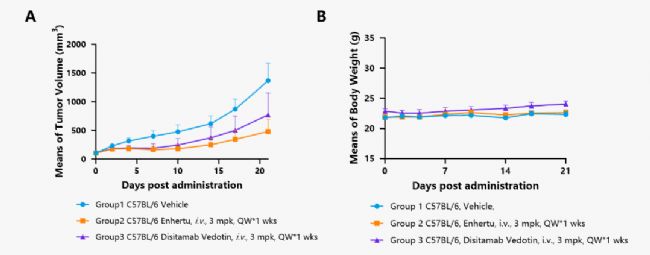 圖6. 靶向NECTIN4的ADC藥物抑制MC38-hNectin4腫瘤細胞進展的體內藥效 (宿主小鼠為C57BL/6背景的hPD-1小鼠)。A.每組小鼠的相對腫瘤體積變化曲線;B.體重。