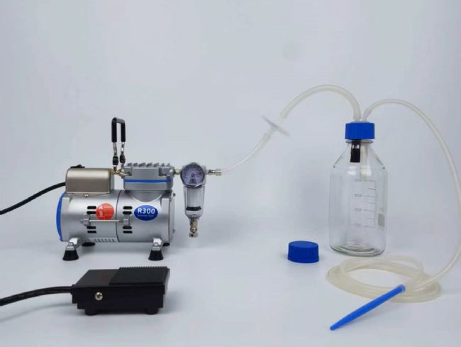 在進(jìn)行這些討論前,我們先來觀察一臺(tái)帶有腳踏開關(guān)的廢液泵具體是如何組成和構(gòu)造的。例如上圖中的BV300EFS帶腳踏開關(guān)的實(shí)驗(yàn)室臺(tái)式廢液泵,其吸液部分和大部分廢液抽吸產(chǎn)品類似,包括了無油吸泵主機(jī)、廢液收集瓶、吸液管、吸頭適配器、調(diào)節(jié)閥、緩沖杯,以及用于防止廢液倒吸的阻水保護(hù)器。不同之處則在于,其主機(jī)電源線并不是直接插在室內(nèi)電源上,而是連接在一只腳踏開關(guān)上。