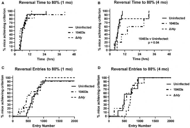 測量動物通過認知墻做出正確選擇的次數(shù),以及達到預(yù)先設(shè)定的成功標準所需的時間,特別是正確選擇的百分比。選擇的進入標準要求動物成功學(xué)習(xí)每項任務(wù),基于在過去30次進入中達到80%的成功率。圖3所示結(jié)果表明,在反轉(zhuǎn)階段,感染10403s的小鼠在感染后4個月達到80%標準所需的時間明顯多于未感染小鼠(圖3B),而在感染后1個月時則沒有差異(圖3A)。盡管感染10403s的小鼠在4個月時需要更多時間才能達到標準(圖3D),但執(zhí)行的進入次數(shù)沒有差異(圖3C,D)。
