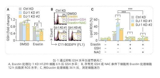《DJ-1 suppresses ferroptosis through preserving the activity of S-adenosyl homocysteine hydrolase》一文圍繞 DJ-1 如何負(fù)調(diào)節(jié)鐵死亡展開機(jī)制研究。研究中觀察到:采用 RNA 干擾抑制 DJ-1 表達(dá)時,可與 Erastin 產(chǎn)生協(xié)同效應(yīng),共同抑制細(xì)胞內(nèi) GSH 水平(相關(guān)結(jié)果如圖 A 所示);而當(dāng)額外加入外源性 GSH 或 NAC 后,Erastin 所誘導(dǎo)的脂質(zhì) ROS 積累(圖 B)和細(xì)胞死亡(圖 C)現(xiàn)象均得到逆轉(zhuǎn)。由此,作者提出推測 ——DJ-1 或許通過調(diào)控 GSH 的合成,來實現(xiàn)對鐵死亡的抑制。