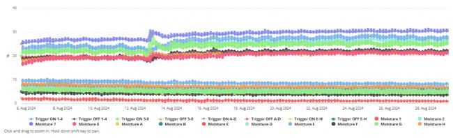 喬治娜指出:“該系統(tǒng)在2024年試驗(yàn)中期投入使用,且取得了顯著成效。土壤水分含量始終保持在目標(biāo)范圍內(nèi),使得灌溉處理小區(qū)與干旱處理小區(qū)形成了明顯的水分差異。”