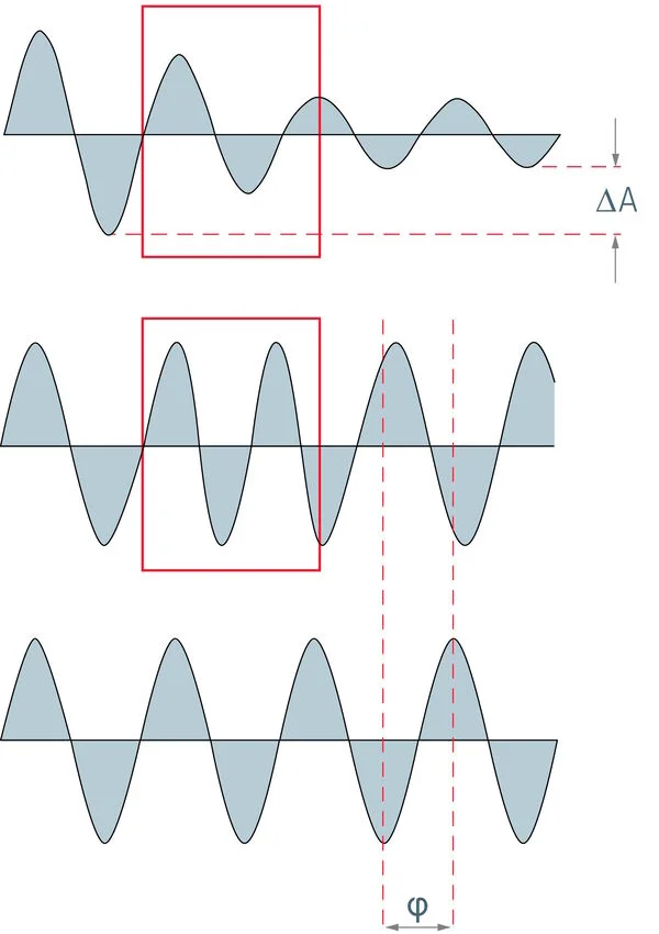 圖 1:振幅對象和相位對象。上排:當(dāng)光線穿過所謂的振幅物體(紅框)時,光波的振幅(A)會降低(ΔA)。人眼會感覺到亮度降低。中間一行:在所謂的相位物體中,光線通過物體時會導(dǎo)致光波的相位移動 (Δj),人眼無法察覺。下排:未發(fā)生變化的光波。