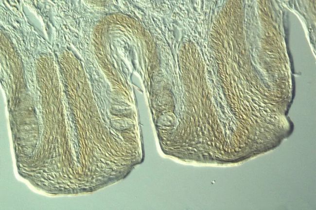 圖 2c:兔味蕾切片,明視野顯微鏡與使用固定和染色的物體相比,使用未染色標(biāo)本具有許多優(yōu)勢。它允許在生物顯微鏡下觀察活體,沒有固定和染色的人工痕跡。例如,固定和染色會使標(biāo)本收縮或膨脹。此外,還有可能破壞細(xì)胞中的獨(dú)特結(jié)構(gòu)或嚴(yán)重改變其形態(tài)。消除這種危險的唯一可靠方法就是使用活體樣本,因?yàn)榛铙w樣本沒有偽影,能提供可靠、真實(shí)的信息。