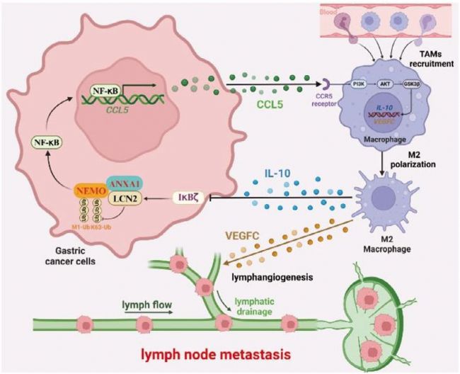 在胃癌(GC)患者群體中,淋巴結(jié)(LN)轉(zhuǎn)移堪稱(chēng)導(dǎo)致預(yù)后不佳的 “頭號(hào)元兇”。腫瘤相關(guān)巨噬細(xì)胞(TAMs)在腫瘤轉(zhuǎn)移與病情進(jìn)展進(jìn)程里扮演著極為關(guān)鍵的角色,然而,其究竟如何誘導(dǎo)胃癌發(fā)生淋巴結(jié)轉(zhuǎn)移,背后的作用機(jī)制至今仍撲朔迷離。