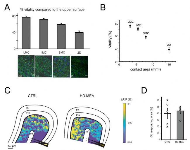 圖3. 平面和3D高分辨微電極陣列(HD-MEA)上小腦切片的組織活力和神經(jīng)活性。A)直方圖顯示了在平面(2D)或 3D HD-MEA 芯片上放置 1 小時后,小腦切片下表面(與芯片接觸)與上表面(與培養(yǎng)基接觸)的活力對比。下方展示了在 40 倍放大下,用鈣黃綠素 AM 負載的小腦切片在 LMC、IMC、SMC 和 2D 上的代表性共聚焦圖像。活細胞呈綠色;細胞核呈藍色(DAPI)。比例尺 = 20 um。注意 3D HD-MEA 芯片上活細胞的百分比更高。B)該圖展示了 A 中 每種配置下下表面與上表面活力的百分比對比。SMC、IMC 和 LMC 的接觸面積根據(jù)微通道寬度估算得出。C)用 VSDi 記錄獲得的偽彩色圖示例,展示了對照組(左)和 3D HD-MEA 上的切片(右)對苔蘚纖維刺激的顆粒層反應(yīng)的空間分布。刺激電極(黑色)位于苔蘚纖維束(MF)上方。GL,顆粒層。PCL,浦 肯野細胞層。ML,分子層。D)直方圖顯示了在 VSDi 實驗中對苔蘚纖維刺激有反應(yīng)的顆粒層面積的百分比。所測試的兩種條件下的面積無顯著差異(數(shù)據(jù)以平均值±均方誤差的形式報告。如文中所述,LMC、IMC、SMC 分別代表具有大、中、小微流控通道的3D高分辨微電極陣列芯片,而 CTRL 表示將組織置于載玻片上。