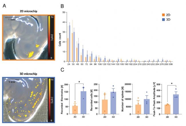 圖 5. 3D高分辨微電極陣列(HD-MEA)相對于平面 HD-MEA 在皮層-海馬切片中的記錄能力。A)皮層-海馬切片的圖像,疊加了由 HD-MEA 電極在 3 分鐘內(nèi)檢測到的相應(yīng)電活動圖(顏色刻度條:0 - 50 個Spike)。上:切片放置在平面 HD-MEA 芯片上;下:切片放置在 3D HD-MEA 芯片上。B)平面和 3D HD-MEA 芯片中按細胞計數(shù)分布的Spike數(shù)量。C)直方圖顯示平面和 3D HD-MEA 芯片記錄的平均活躍電極數(shù)量、平均活躍細胞數(shù)量、平均總Spike數(shù)量以及Spike的峰峰值幅度。在 B 和 C 中,直方圖報告平均值±標準誤,星號表示顯著差異(* p < 0.05)。