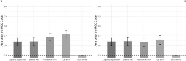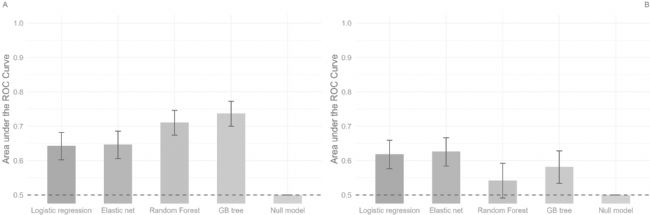研究團(tuán)隊一開始測了很多指標(biāo)(即全生物標(biāo)志物,圖 1B),但最后發(fā)現(xiàn):只選 8 個關(guān)鍵指標(biāo)(比如 DHEA-S、TSH、CRP 這些)組合起來分析(圖 1A),反而最能分清 “試過自殺” 和 “沒試過自殺” 的孩子。全生物標(biāo)志物組(圖 1B):AUC 僅 0.635-0.659(整體 “較差”),復(fù)雜模型(梯度提升樹)僅 0.659,說明納入過多無關(guān)指標(biāo)(如 rfNIRS 血氧、rHRV)反而干擾判斷。精簡生物標(biāo)志物組(圖 1A)AUC 提升至 0.639-0.717(“較差 - 尚可”),其中梯度提升樹達(dá) 0.717,是所有模型中最高。