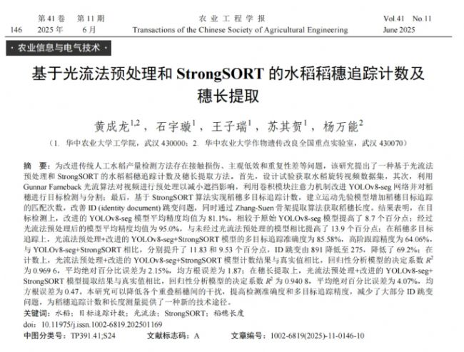 分享華中農(nóng)業(yè)大學等單位黃成龍、石宇璇、王子瑞、蘇其賀與楊萬能團隊在《農(nóng)業(yè)工程學報》2025年第41卷第11期刊載的的論文——“基于光流法預處理和StrongSORT的水稻稻穗追蹤計數(shù)及穗長提取”。該研究由國家自然科學基金項目(項目號:32270431)等資助。