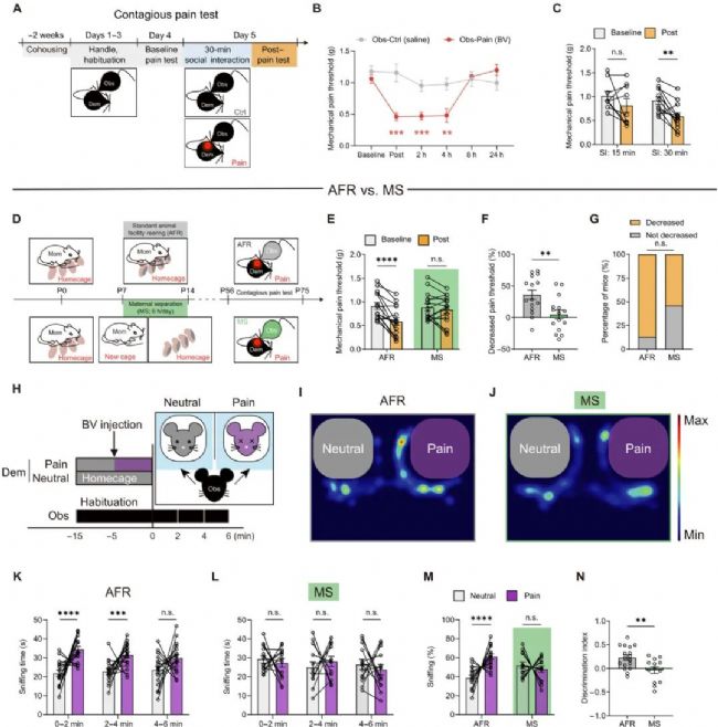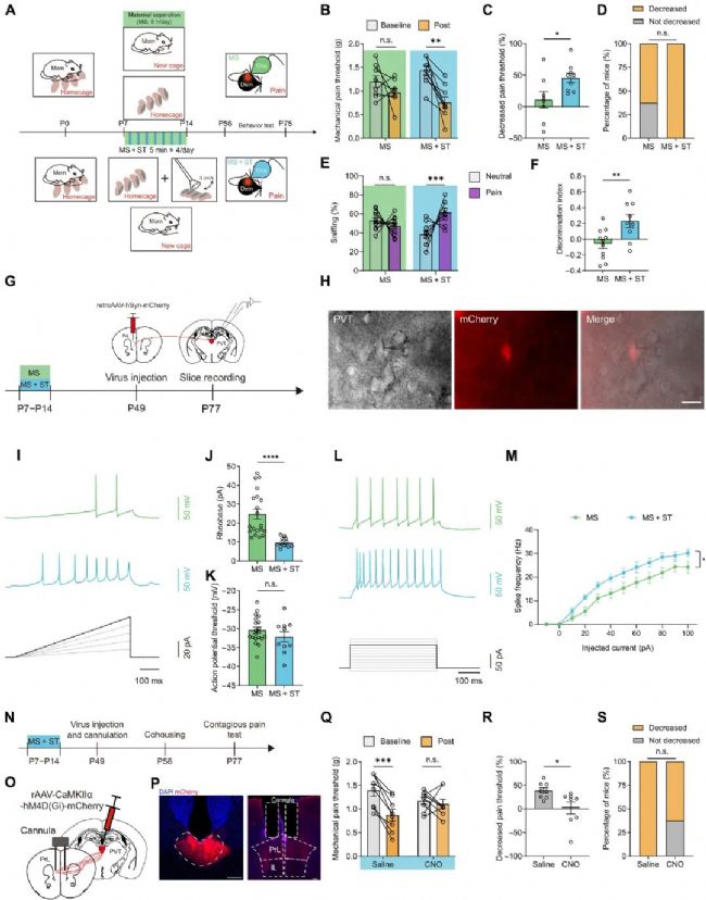 研究者首先建立了傳染性疼痛的小鼠模型:觀察鼠與演示鼠共住2周建立熟悉關(guān)系后,將觀察鼠與注射蜂毒誘發(fā)炎癥疼痛的演示鼠互動30分鐘。結(jié)果顯示,觀察鼠在與疼痛同伴互動后出現(xiàn)顯著的機械痛閾下降,持續(xù)至少4小時。緊接著,研究者采用了修改后的MS范式:從出生后第7天起,小鼠幼崽每天與母親分離6小時,連續(xù)7天。成年期行為學(xué)測試顯示,MS處理的觀察鼠表現(xiàn)出顯著的傳染性疼痛缺陷,提示生命早期MS處理的確可以導(dǎo)致成年期疼痛共情受損。