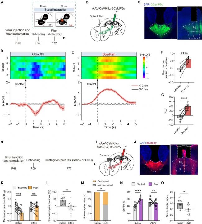 圖3. PVT → PrL神經(jīng)環(huán)路介導(dǎo)了疼痛的傳染。