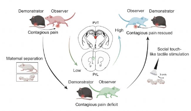2025年10月9日,上海交通大學(xué)醫(yī)學(xué)院附屬上海兒童醫(yī)學(xué)中心江帆教授、浙江省甌江實驗室劉明剛研究員聯(lián)合上海交通大學(xué)醫(yī)學(xué)院徐天樂教授研究團隊在Science Advances雜志上發(fā)表了題為“Dysfunction of the paraventricular thalamus-prelimbic cortex circuit underlies maternal separation-induced deficits in contagious pain”的研究論文,系統(tǒng)揭示了母嬰分離導(dǎo)致傳染性疼痛共情缺陷的神經(jīng)機制。
