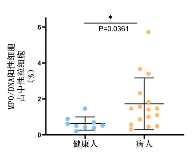 使用本試劑盒檢測自身免疫病患者和健康對照,患者樣本NETs陽性率顯著高于健康對照,提示疾病狀態(tài)下NETs釋放增加,驗(yàn)證了NETs作為疾病活動性標(biāo)志物的價(jià)值。