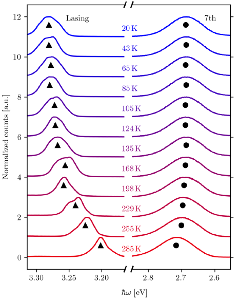 本文進(jìn)行了溫度和強(qiáng)度相關(guān)的測(cè)量,以直接探究Mott相變隨溫度的變化情況,從而展示了該儀器在研究固體中重要相變方面的實(shí)用性。下圖是在中紅外強(qiáng)度高于Mott相變(0.473 ± 0.015 TW/cm2)的情況下收集的。激光模式(實(shí)心三角形)清晰地顯示了隨著溫度的變化而產(chǎn)生的能量偏移,而諧波(實(shí)心圓)則在溫度變化方面幾乎沒(méi)有偏差,研究人員將其歸因于驅(qū)動(dòng)光的光子能量的輕微熱漂移。