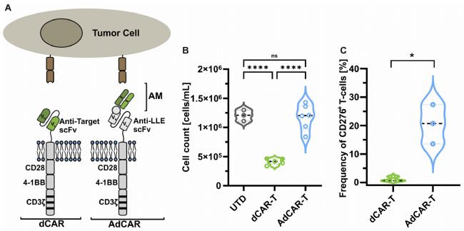 Fab適配分子AM 停藥后,快速清除,AdCAR-T 進(jìn)入“休息”期,減少持續(xù)信號(hào)導(dǎo)致的耗竭。