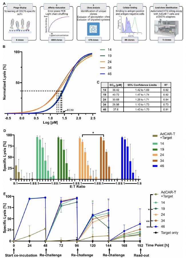 人源 scFv 噬菌體庫 → 親和力成熟 → 5 個(gè)先導(dǎo) Fab-AM(AM14/19/24/34/46)。