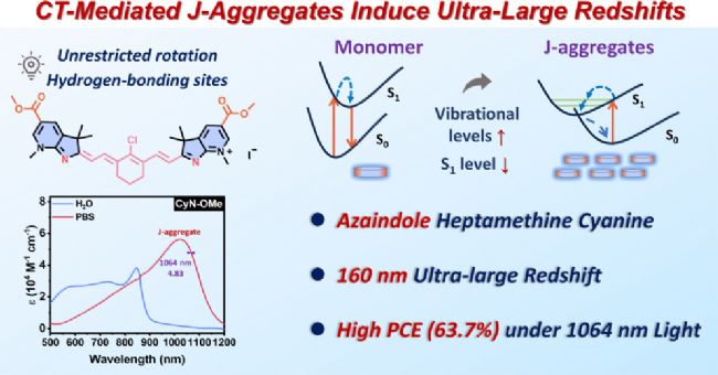 本文要點:具有超大紅移(>150 nm)特性的有機生色團J聚集現(xiàn)象,為在第二近紅外(NIR-II,1000–1700 nm)波段推進腫瘤光熱治療提供了一種極具潛力的策略。本研究通過引入氮雜吲哚基團設(shè)計合成了七甲川菁染料CyN-OMe,該基團可精準調(diào)控分子內(nèi)電子分布與分子間相互作用,促使CyN-OMe在生理鹽水中快速形成電荷轉(zhuǎn)移介導(dǎo)的J-聚集體。該聚集體最大吸收波長紅移至1035 nm(NIR-II窗口),較單體產(chǎn)生160 nm顯著紅移。本文系統(tǒng)探究了CyN-OMe J-聚集體的形成機制,并評估了其在不同條件下的穩(wěn)定性。該聚集體在1064 nm激光照射下展現(xiàn)出63.7%的高光熱轉(zhuǎn)換效率,成功在小鼠模型中實現(xiàn)腫瘤完全消融。本工作為開發(fā)具有超大紅移特性的J-聚集體提供了普適性分子設(shè)計策略。