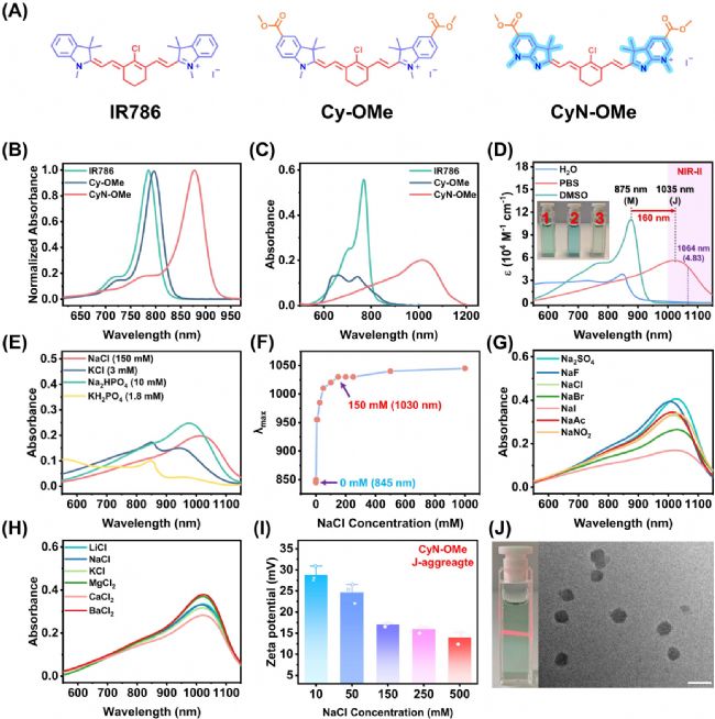 CyN-OMe在室溫PBS中可自發(fā)形成J-聚集體,通過改變PBS鹽組分引發(fā)CyN-OMe最大吸收波長(λmax)偏移,證實無機鹽濃度對分子聚集起主導(dǎo)作用(圖1E)。以NaCl為模型鹽的動力學研究發(fā)現(xiàn)兩個關(guān)鍵濃度閾值:>1 mM的活化閾值與>150 mM的飽和閾值(圖1F)。根據(jù)霍夫邁斯特序列,檢測了CyN-OMe在不同陰陽離子溶液中的吸收光譜:相較于小陰離子(F-),大陰離子(I-)顯著降低吸光度,表明其空間位阻阻礙了關(guān)鍵π軌道堆積(圖1G);而陽離子引起的光譜變化可忽略(圖1H),證實CyN-OMe聚集主要由電荷屏蔽而非特異性離子配對主導(dǎo)。由德拜長度定義的屏蔽范圍決定了表面電荷的空間影響:高離子強度下的短德拜長度會增強電荷屏蔽,顯著降低體系zeta電位。實驗數(shù)據(jù)顯示,提高NaCl濃度會持續(xù)降低CyN-OMe J-聚集體的zeta電位(圖1I),由此提出鹽增強J-聚集的雙重機制:(1)增強的德拜屏蔽克服陽離子染料分子間長程靜電排斥,實現(xiàn)更緊密的分子接近;(2)鹽析效應(yīng)降低水合作用,促進π-π堆積驅(qū)動的"頭對尾"分子排列。這種協(xié)同機制通過電荷調(diào)控與溶劑化控制,從熱力學上推動有序J-聚集體結(jié)構(gòu)的形成。透射電鏡(TEM)分析顯示,CyN-OMe在PBS中主要自組裝成平均直徑約65 nm的規(guī)則球形納米顆粒(圖1J)。