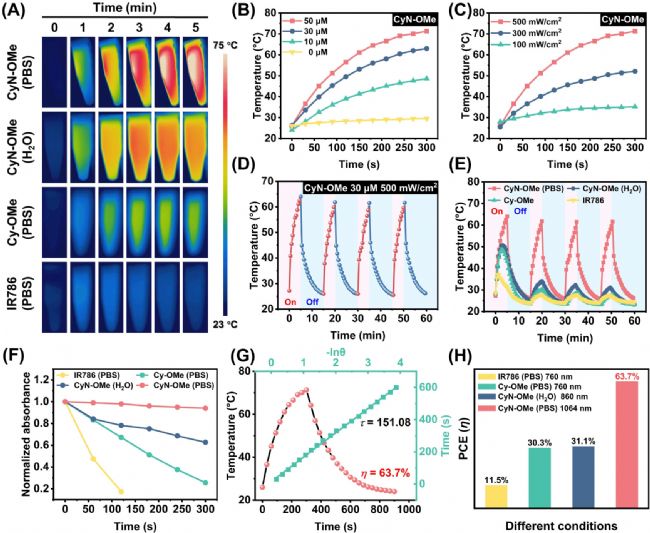 接著系統(tǒng)評估了IR786、Cy-OMe、CyN-OMe及其J-聚集體的光熱轉(zhuǎn)換性能。測試方案如下:IR786和Cy-OMe在PBS中采用760 nm激光照射,CyN-OMe分別在DI水(非聚集態(tài),860 nm激光)和PBS(J-聚集體,1064 nm激光)中測試。由于顯著的吸收紅移,CyN-OMe J-聚集體在1064 nm處展現(xiàn)出4.83×10⁴ M⁻¹ cm⁻¹的摩爾消光系數(shù)(圖1D),凸顯其在NIR-II窗口光熱治療(PTT)中的應(yīng)用優(yōu)勢。實驗數(shù)據(jù)顯示,在0.5 W cm⁻²功率密度激光照射下,PBS中的CyN-OMe J-聚集體5分鐘內(nèi)使體系溫度從23℃急速升至71.3℃,遠超其在DI水中的升溫幅度(59.6℃)。對比組中,Cy-OMe和IR786的最高溫度分別為49.1℃和39.4℃,證實甲氧羰基的引入有效提升了光熱轉(zhuǎn)換效率(PCE)。