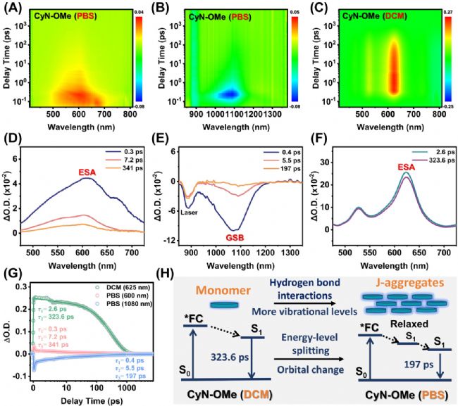 接著研究者深入研究了電荷轉(zhuǎn)移(CT)介導(dǎo)的CyN-OMe J-聚集體激發(fā)態(tài)動力學。通過飛秒瞬態(tài)吸收(fs-TA)光譜技術(shù)發(fā)現(xiàn):當采用880 nm激光激發(fā)時,PBS中的CyN-OMe在500-700 nm范圍呈現(xiàn)明顯的激發(fā)態(tài)吸收(ESA)帶(對應(yīng)S₁→Sₙ躍遷),同時在950-1200 nm出現(xiàn)與穩(wěn)態(tài)吸收峰匹配的基態(tài)漂白(GSB)帶(圖3B)。全局動力學分析揭示其激發(fā)態(tài)弛豫路徑為:Franck–Condon(FC)態(tài)→弛豫S₁態(tài)→S₁→S₀(圖3H),其中FC態(tài)弛豫僅需2.6 ps,S₁→S₀恢復(fù)為323.6 ps,且未觀測到中間態(tài)。相較于二氯甲烷(DCM)中575-675 nm的窄ESA帶,PBS體系展現(xiàn)出更寬泛的激發(fā)態(tài)吸收特征(圖3C,F,G)。分子結(jié)構(gòu)修飾(特別是甲氧羰基取代氮雜吲哚的引入)通過增強振動弛豫、降低S₁能級(符合能隙定律)并誘導(dǎo)吸收紅移,最終實現(xiàn)高效非輻射衰變(kₙᵣ≈1)。對比IR786和Cy-OMe證實CyN-OMe J-聚集體具有三大特征:超快S₁衰變(<1 ns)、可忽略熒光(ΦF<0.1%)及無三重態(tài)生成(kISC≈0),這些特性共同促成了其卓越的光熱轉(zhuǎn)換效率。